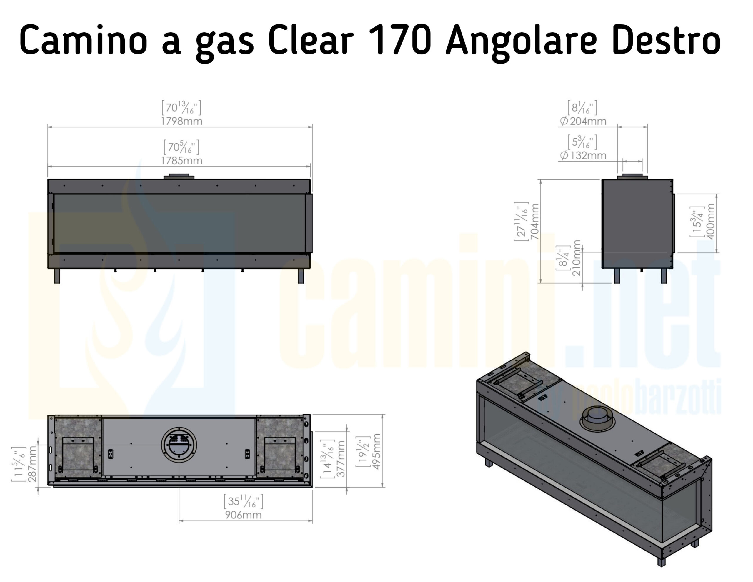 Il camino a gas Clear 170 Angolare è dotato di un bruciatore lineare da 135 cm, che crea fiamme ampie e corpose, in grado di riscaldare la stanza e soddisfare la vista. Il camino a gas viene installato utilizzando una canna coassiale da 130/200 cm, ma è compatibile anche con il “sistema aspirato” che, attraverso una tubatura di scarico di soli 8 cm di diametro, permette di installare questo prodotto anche in assenza di una canna fumaria tradizionale. La camera di combustione può essere liberamente personalizzata scegliendo tra 2 kit di decorazione: