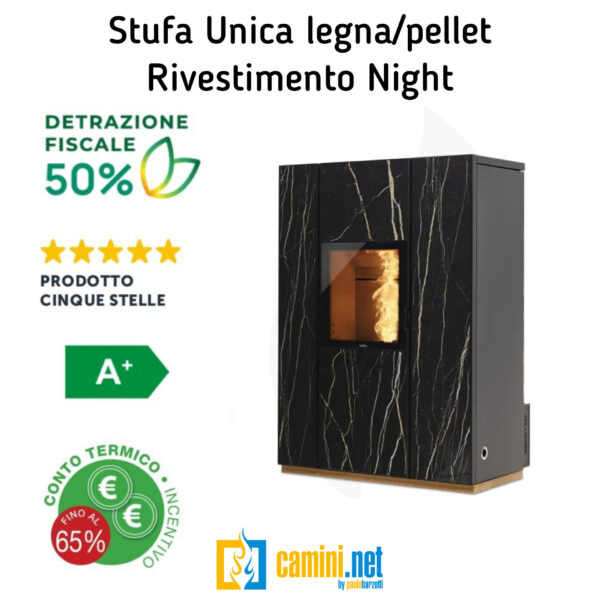 La stufa Unica consente di avere all’interno di un unico prodotto una stufa a legna ed una a pellet, utilizzando una sola camera di combustione. La stufa unica è in grado di gestire in autonomia il passaggio da un combustibile e l’altro, grazie ai sensori presenti sulla macchina e ad una centralina elettronica. Questa stufa è disponibile in 5 colorazioni: Carrara, Dark, Grey, Night e Bianco.